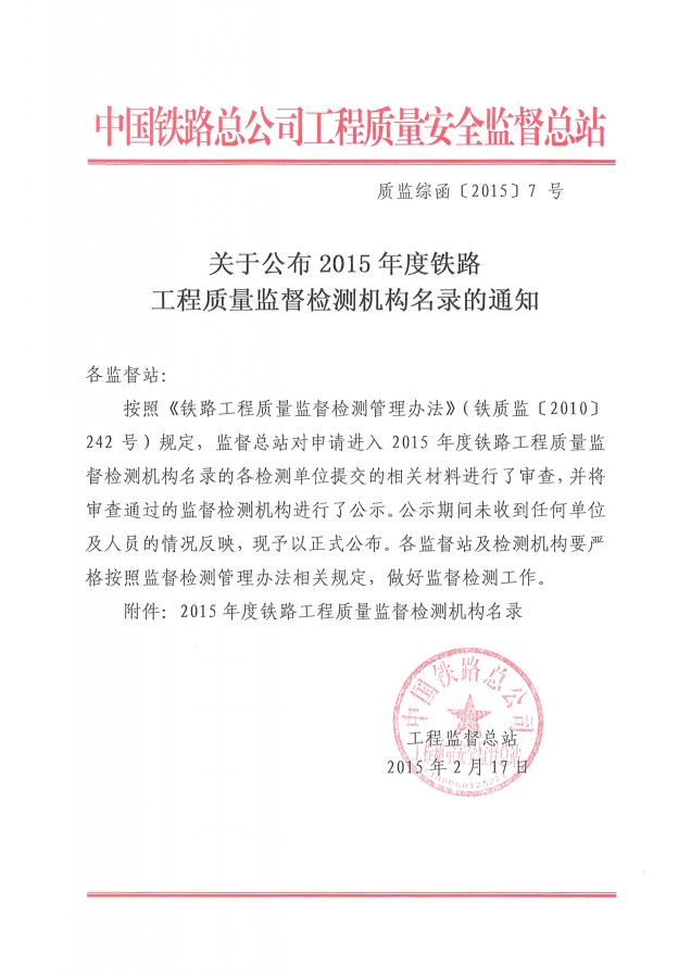 2015年2月17日,中国铁路总公司工程质量安全监督总站公布了2015年度铁路工程质量监督检测机构名录。我公司在原有 砼及原材料、岩土、基桩、隧道 专项的基础上新增了 轨道和钢结构 专项,现已通过资料审查、公示、获准公布。在此感谢所有合作单位对我公司的支持和认可,我们将严格按照监督检测管理办法相关规定,竭诚做好各项监督检测工作。