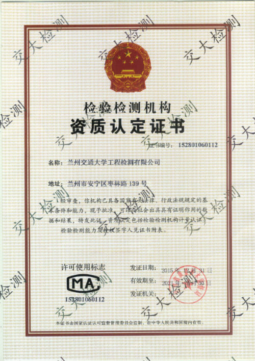 经过评审,专家组认为我公司的环境条件、仪器设备、人员素质、质量体系的运行情况等符合评审准则的要求;检测项目具备现行有效的标准和技术规范,仪器设备能满足检测工作的需要,经过现场评审,专家组一致认为,符合换证要求。并于2015年12月31日对我公司颁发检验检测机构资质认定证书。