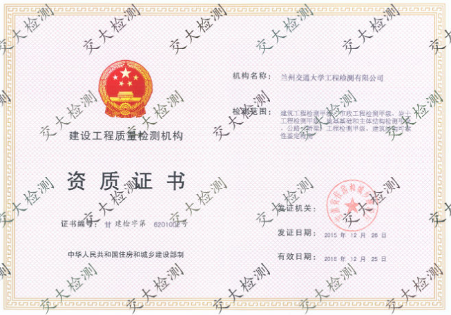2015年11月30日我公司向甘肃省建设主管部门进行了检测资质换证及市政工程升甲级申报工作,经过资料审核和现场核查,我公司顺利通过甘肃省建设工程质量检测机构资质换证及市政工程升甲级工作,并于2015年12月26日获建设工程质量检测机构资质证书。